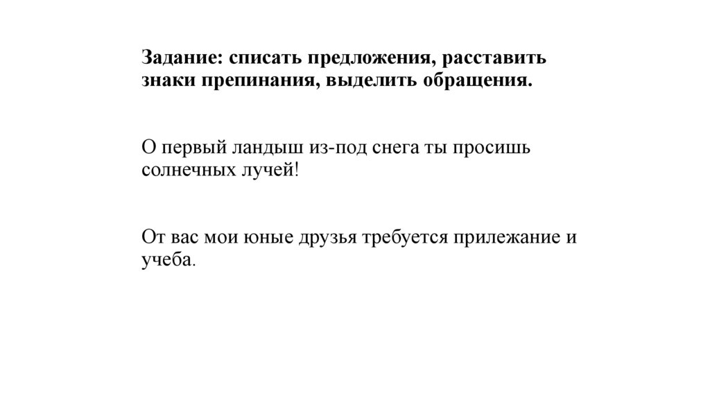 Задание: списать предложения, расставитьзнаки препинания, выделить обращения.