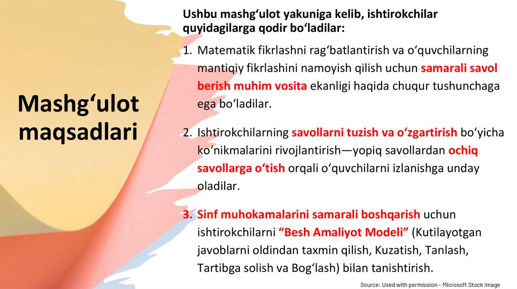 ishtirokchilarni “Besh Amaliyot Modeli” (Kutilayotgan