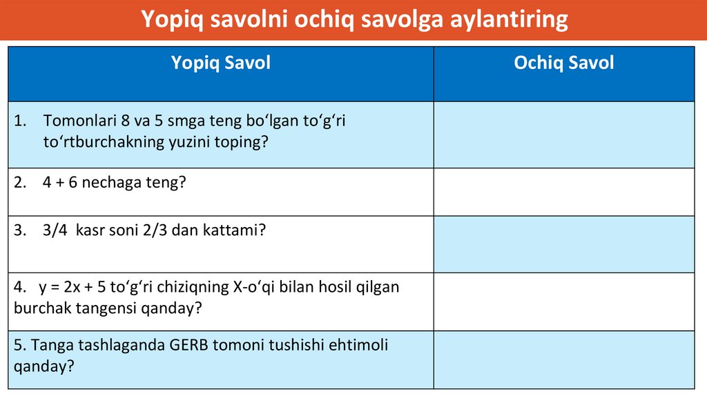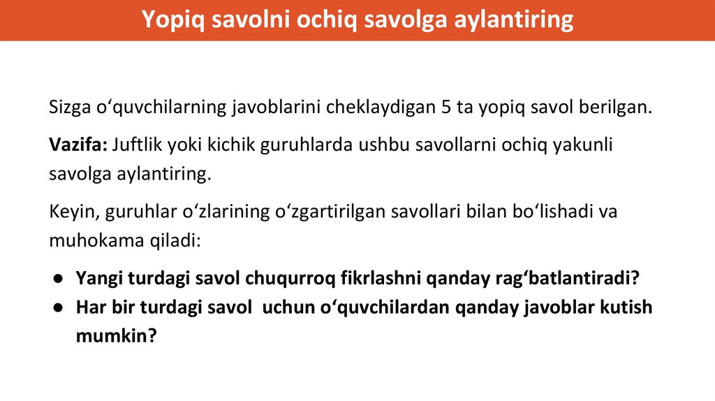 ko‘nikmalarini rivojlantirish—yopiq savollardan ochiq