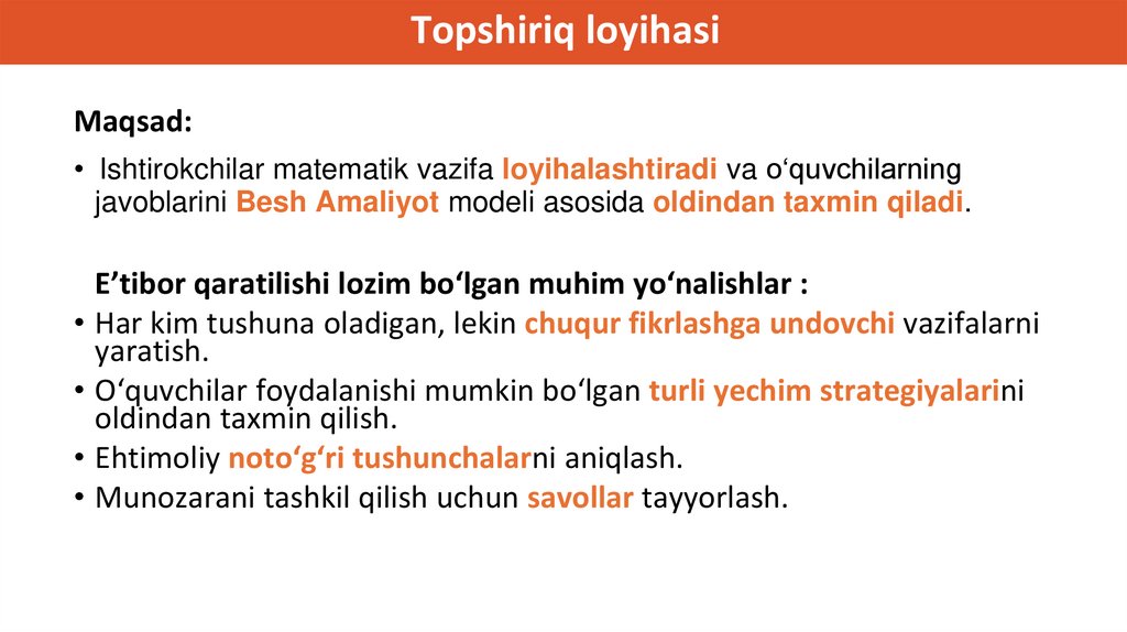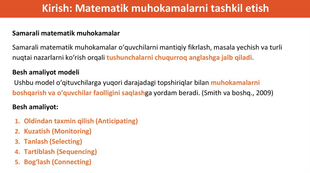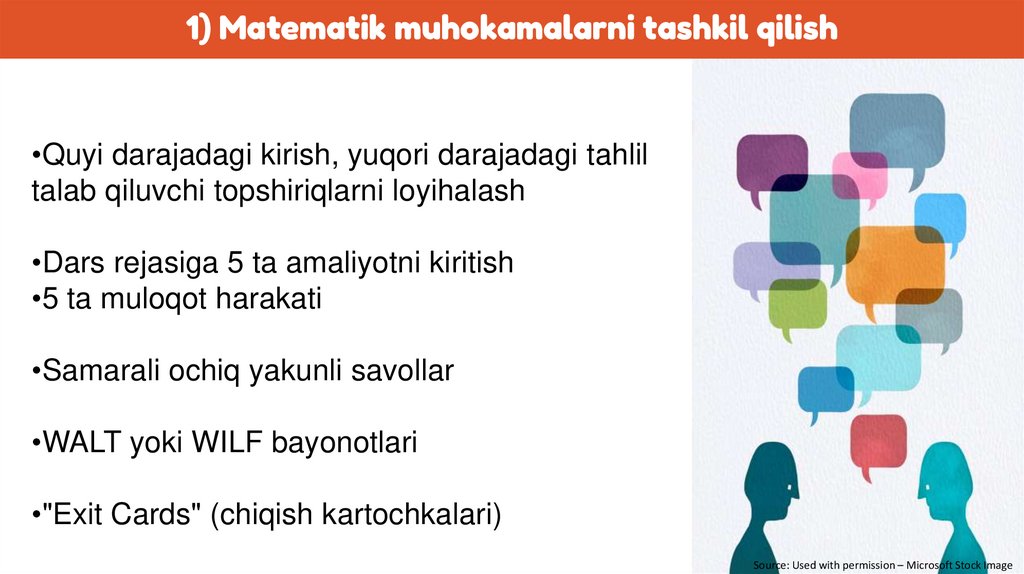 1) Matematik muhokamalarni tashkil qilish•Quyi darajadagi kirish, yuqori darajadagi tahlil