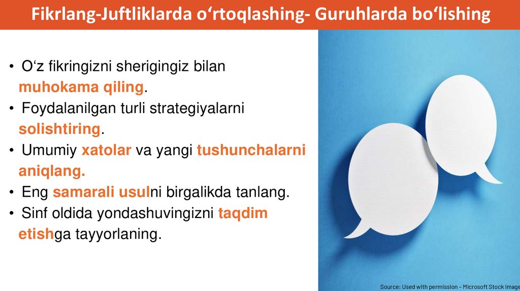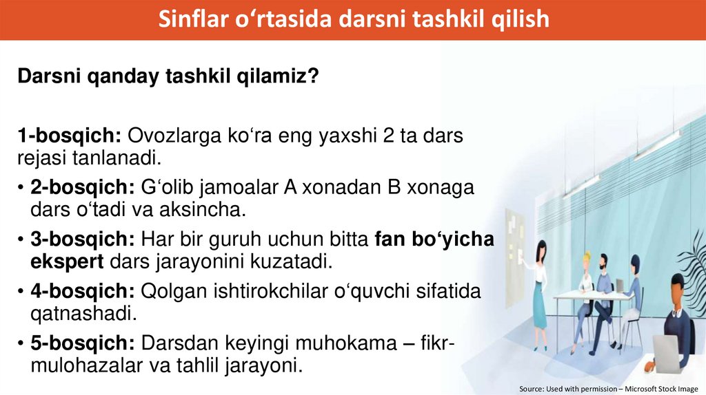 • 4-bosqich: Qolgan ishtirokchilar o‘quvchi sifatida