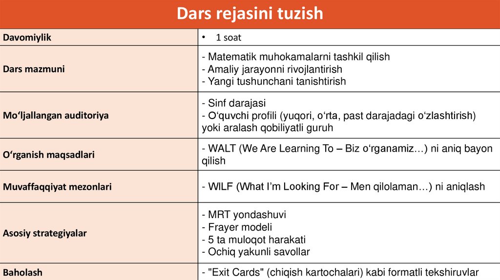 •WALT yoki WILF bayonotlari (Biz o‘rganamiz…/Nimani