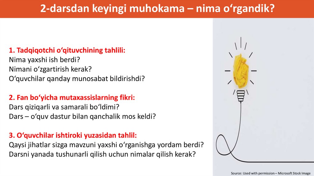 2-darsdan keyingi muhokama – nima o‘rgandik?1. Tadqiqotchi o‘qituvchining tahlili: