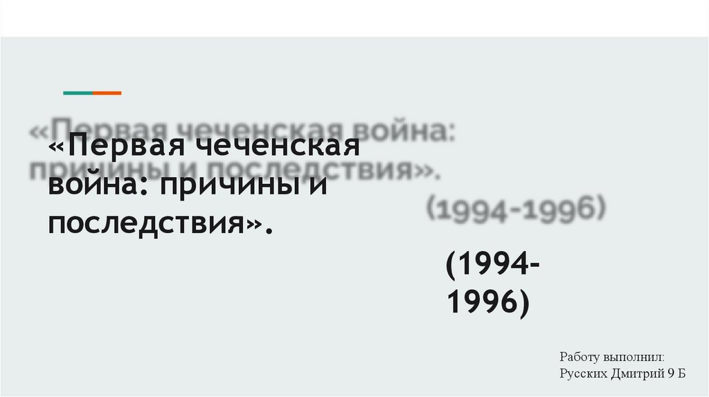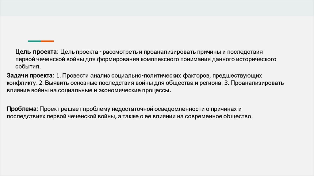 Цель проекта: Цель проекта - рассмотреть и проанализировать причины и последствияпервой чеченской войны для формирования комплексного понимания данного исторического