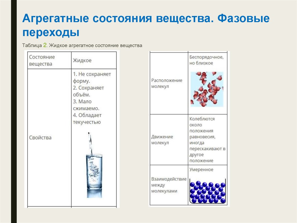 Таблица 2. Жидкое агрегатное состояние вещества