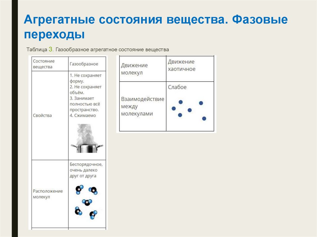 Таблица 3. Газообразное агрегатное состояние вещества