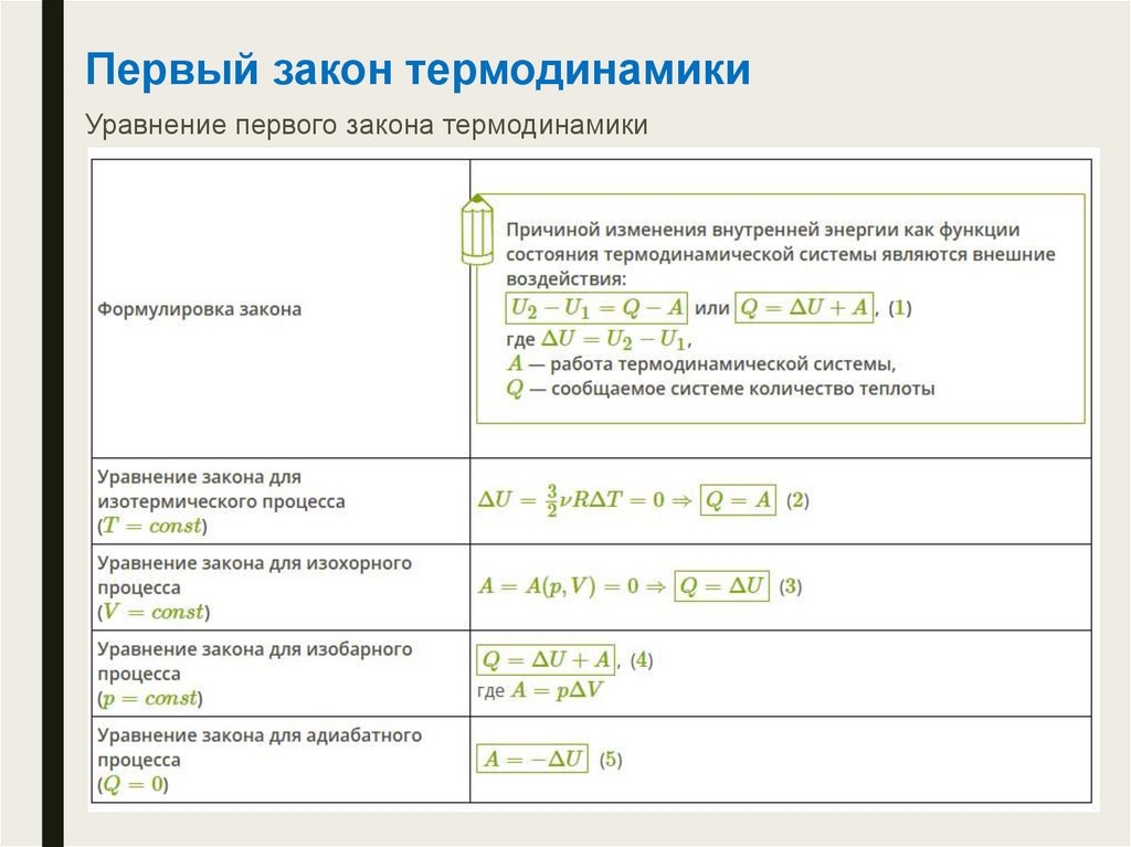 Первый закон термодинамикиУравнение первого закона термодинамики