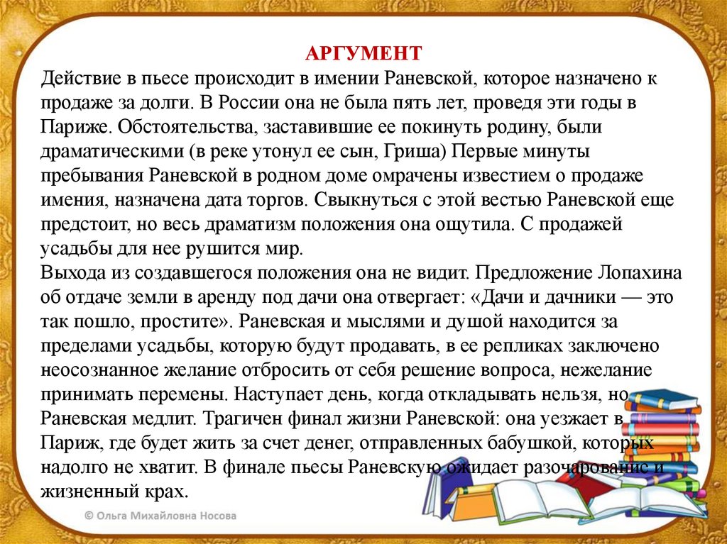 АРГУМЕНТДействие в пьесе происходит в имении Раневской, которое назначено к