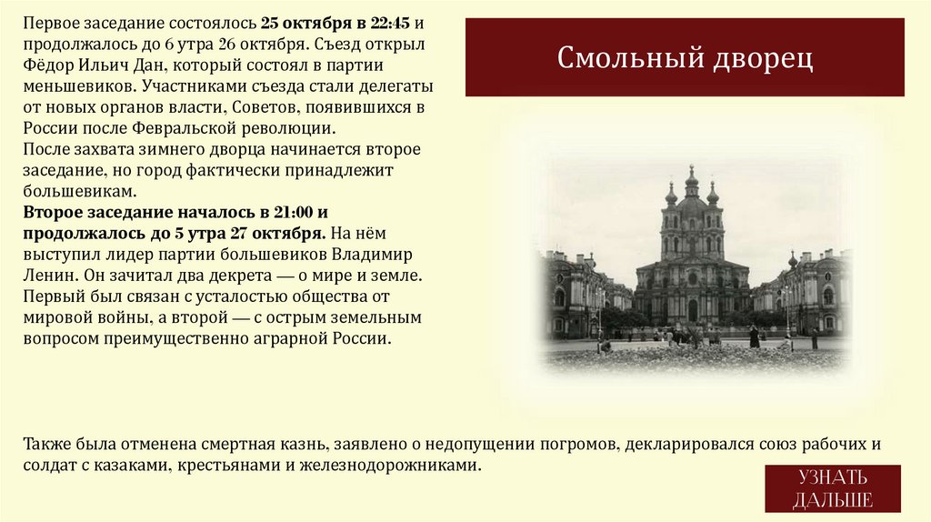 Одновременно со штурмом дворца в Петрограде открылся и прошёл 25 октября в Смольном дворце,