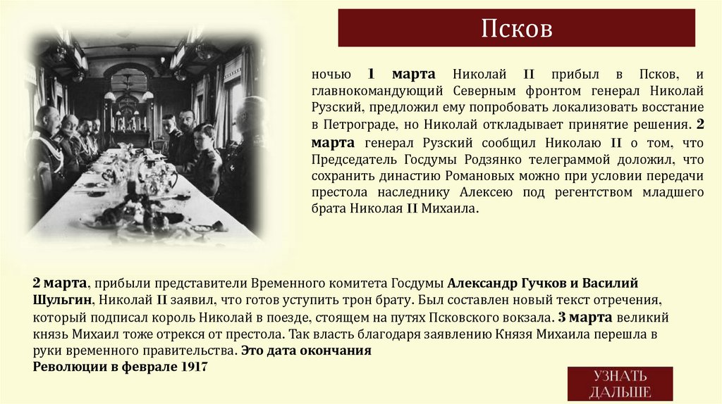 Псковночью 1 марта Николай II прибыл в Псков, и