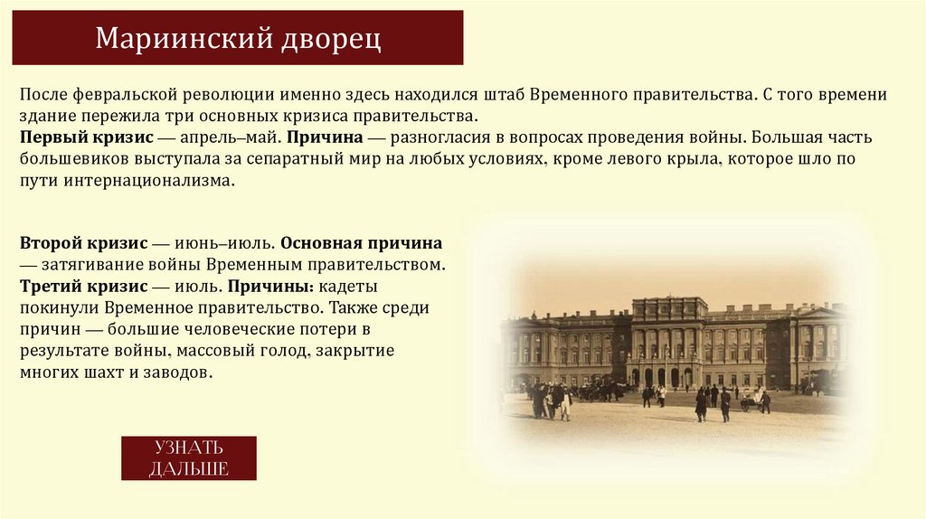 Мариинский дворецПосле февральской революции именно здесь находился штаб Временного правительства. С того времени