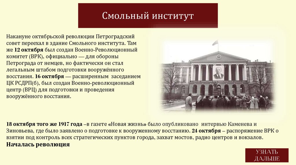 Зиновьева, где было заявлено о подготовке к вооруженному восстанию. 24 октября – распоряжение ВРК о