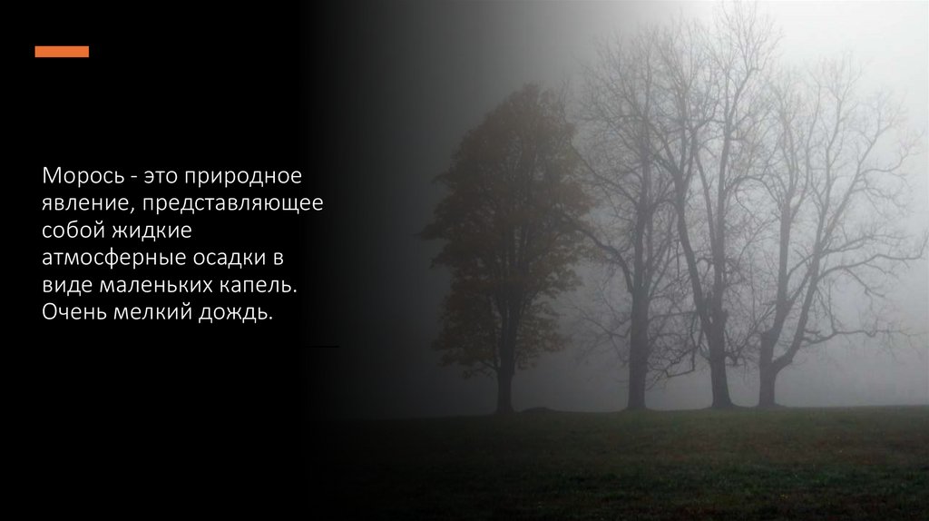 6. Морось - это природное явление, представляющее собой жидкие атмосферные осадки в виде маленьких капель. Очень мелкий дождь.