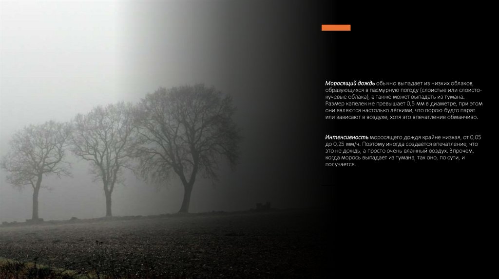 Интенсивность моросящего дождя крайне низкая, от 0,05