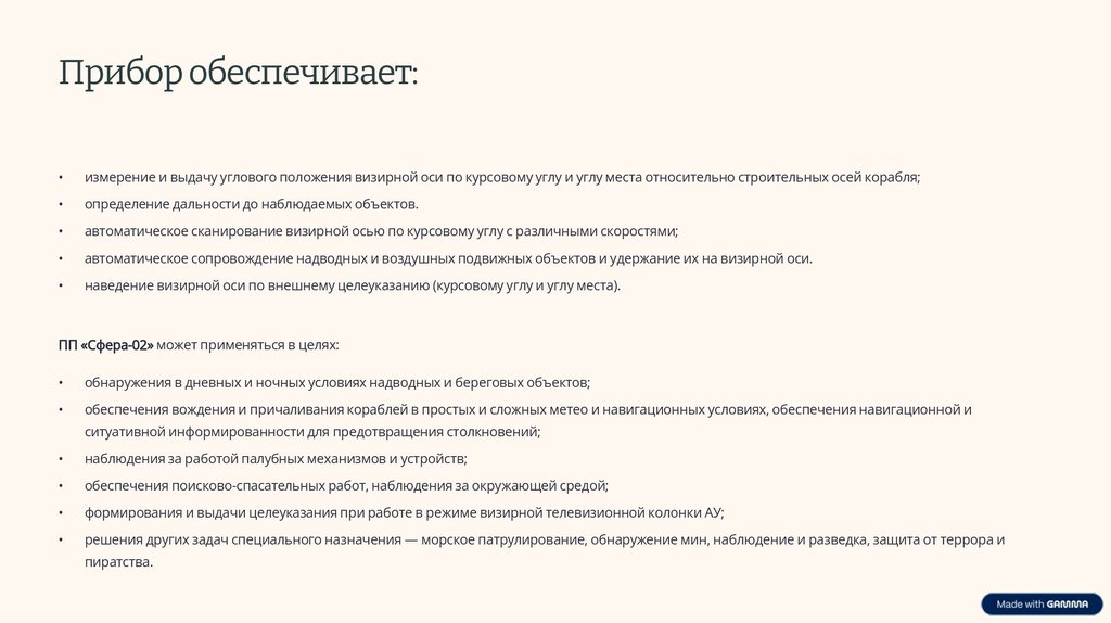 Прибор обеспечивает:измерение и выдачу углового положения визирной оси по курсовому углу и углу места относительно строительных осей корабля;