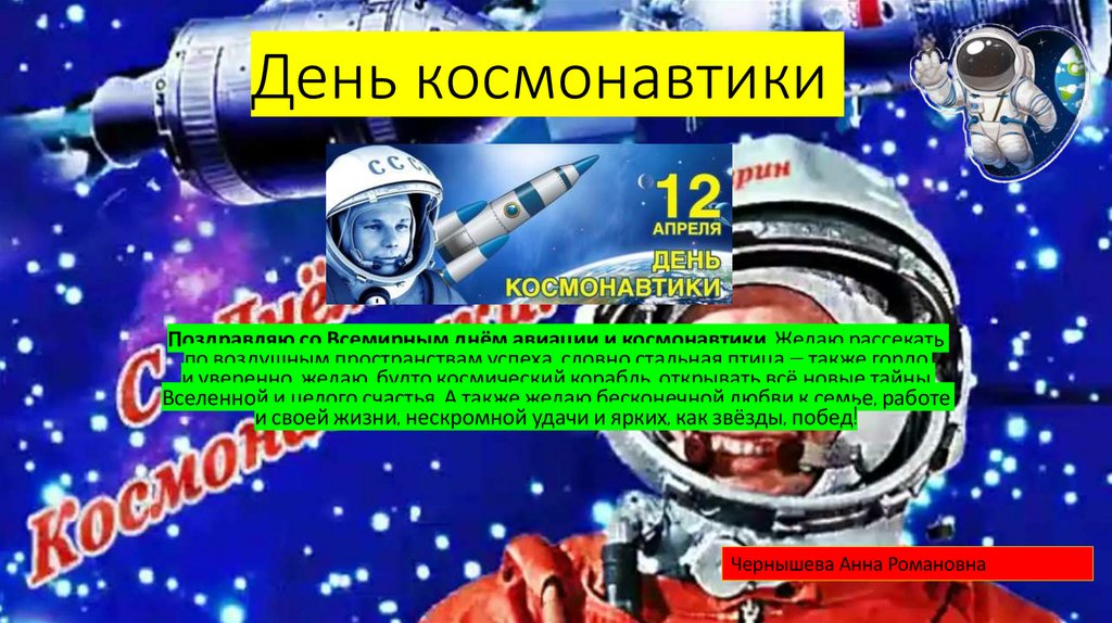 Поздравляю со Всемирным днём авиации и космонавтики. Желаю рассекатьпо воздушным пространствам успеха, словно стальная птица — также гордо