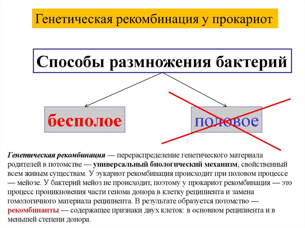 — мейозе. У бактерий мейоз не происходит, поэтому у прокариот рекомбинация — это