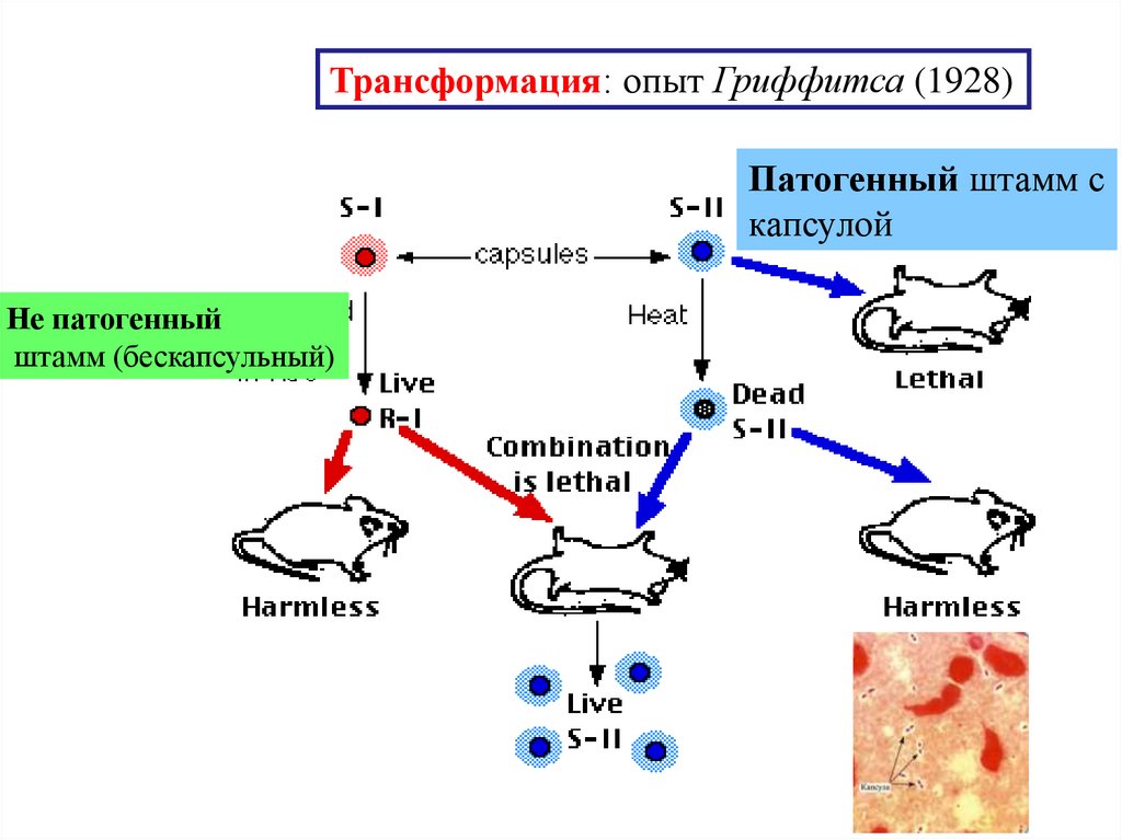 Трансформация: опыт Гриффитса (1928)Патогенный штамм с