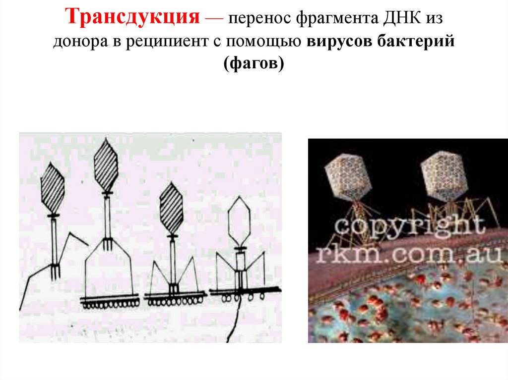Трансдукция — перенос фрагмента ДНК издонора в реципиент с помощью вирусов бактерий