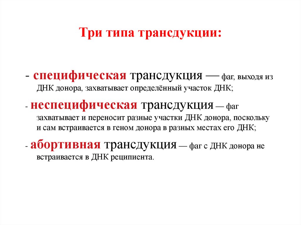 Три типа трансдукции:- специфическая трансдукция — фаг, выходя из