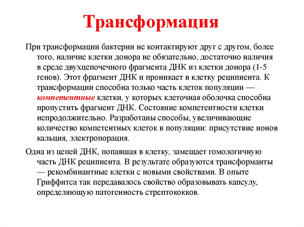 ТрансформацияПри трансформации бактерии не контактируют друг с другом, более