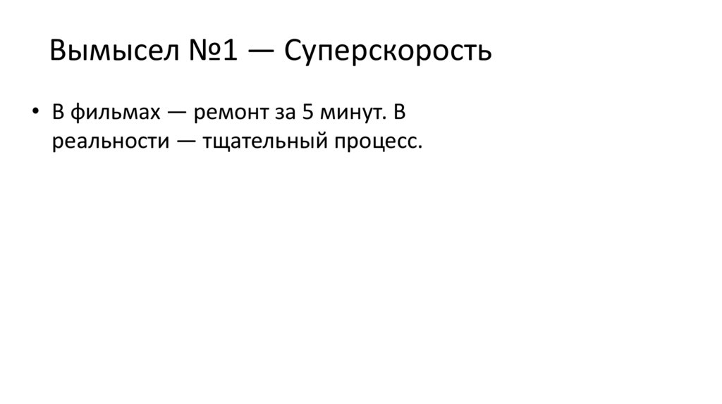 Вымысел №1 — Суперскорость• В фильмах — ремонт за 5 минут. В
