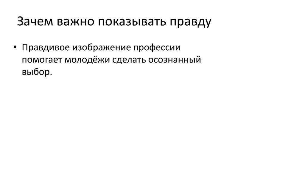Зачем важно показывать правду• Правдивое изображение профессии