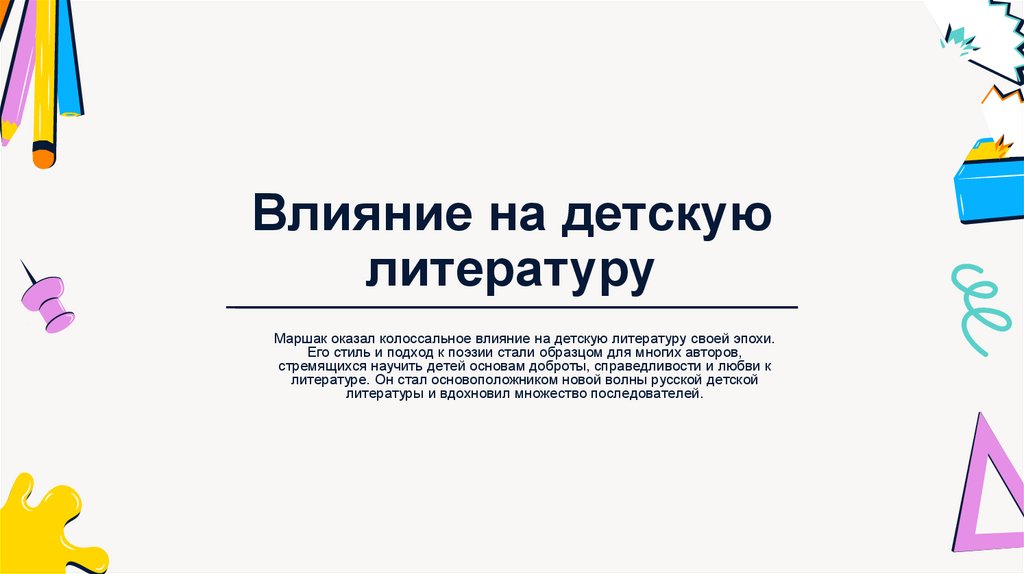 Маршак оказал колоссальное влияние на детскую литературу своей эпохи.