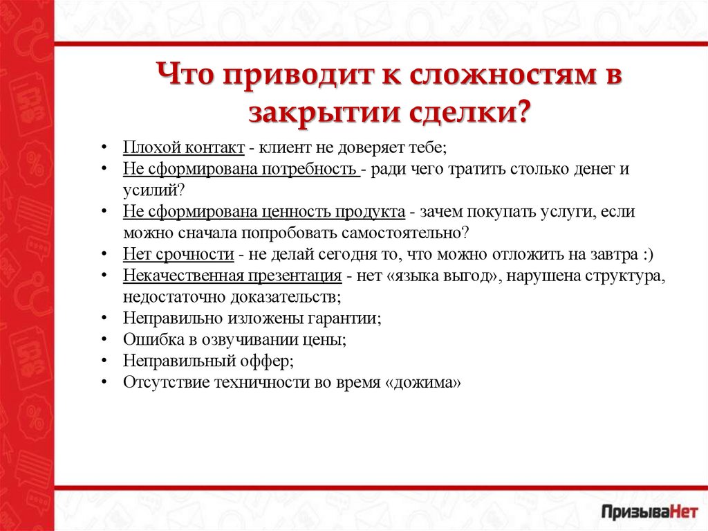 • Некачественная презентация - нет «языка выгод», нарушена структура,