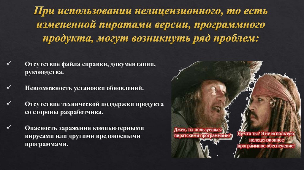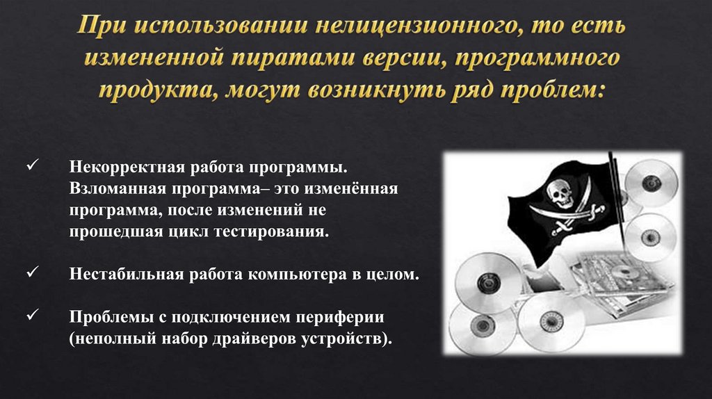 21. При использовании нелицензионного, то есть измененной пиратами версии, программного продукта, могут возникнуть ряд проблем: