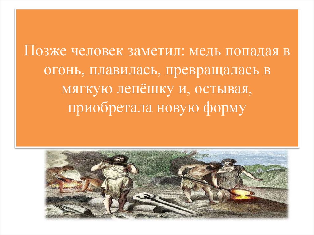 8. Позже человек заметил: медь попадая в огонь, плавилась, превращалась в мягкую лепёшку и, остывая, приобретала новую форму