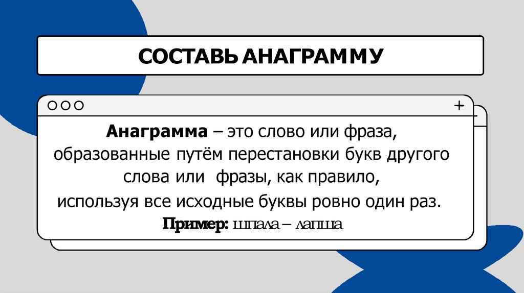 Анаграмма – это слово или фраза,образованные путём перестановки букв другого