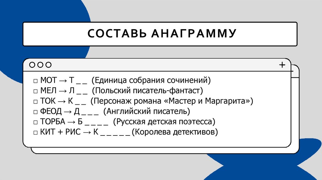 □ МОТ → Т _ _ (Единица собрания сочинений)□ МЕЛ → Л _ _ (Польский писатель-фантаст)