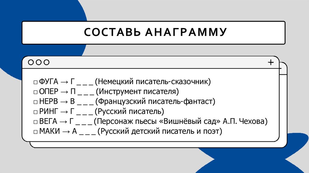 □ ФУГА → Г _ _ _ (Немецкий писатель-сказочник)□ ОПЕР → П _ _ _ (Инструмент писателя)