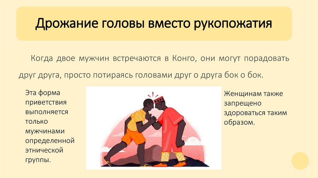 Дрожание головы вместо рукопожатияКогда двое мужчин встречаются в Конго, они могут порадовать