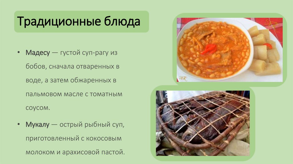 Традиционные блюда• Мадесу — густой суп-рагу из