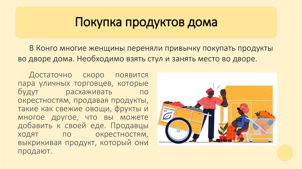Покупка продуктов домаВ Конго многие женщины переняли привычку покупать продукты