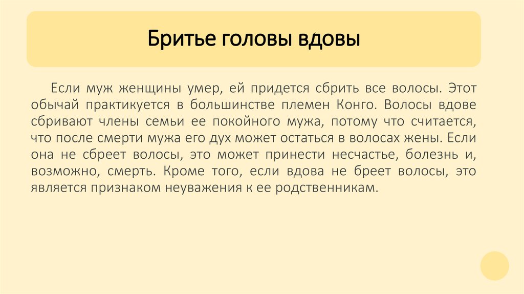 обычай практикуется в большинстве племен Конго. Волосы вдове