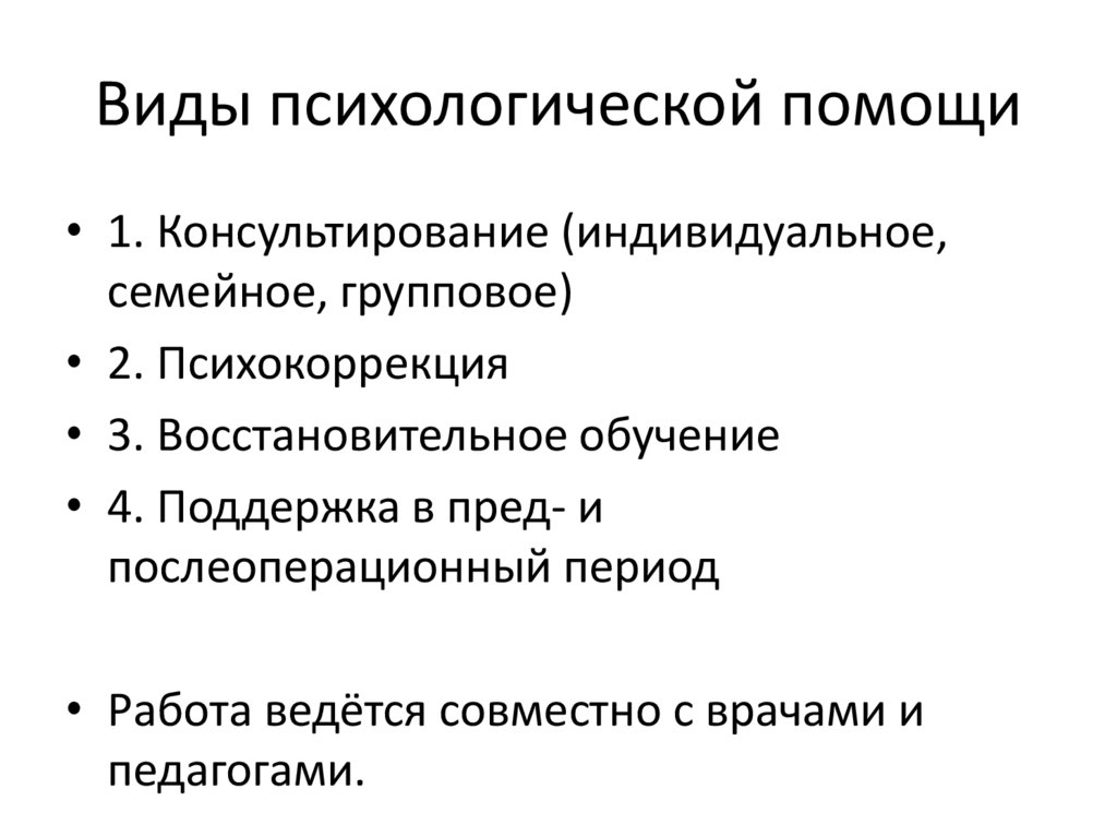 Виды психологической помощи• 1. Консультирование (индивидуальное,