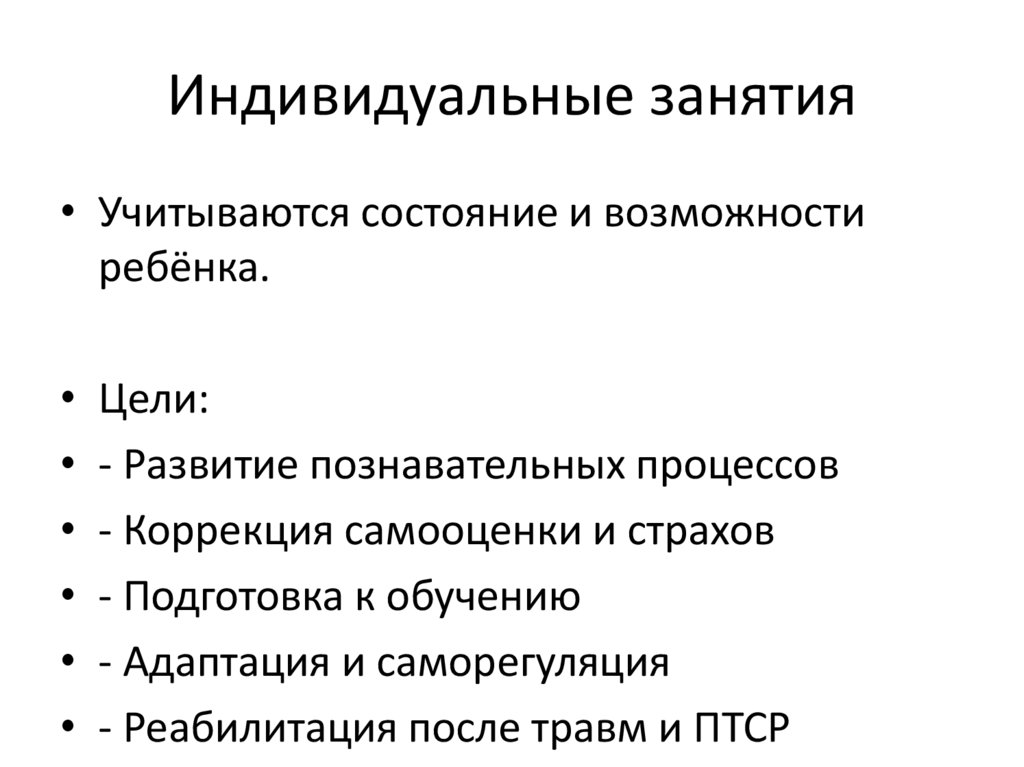 Индивидуальные занятия• Учитываются состояние и возможности