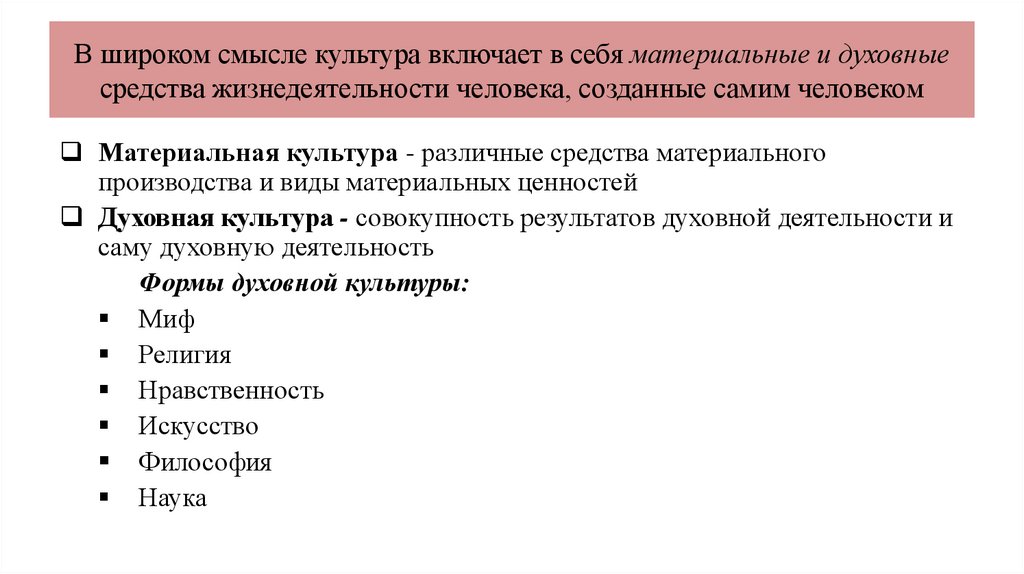 4. В широком смысле культура включает в себя материальные и духовные средства жизнедеятельности человека, созданные самим