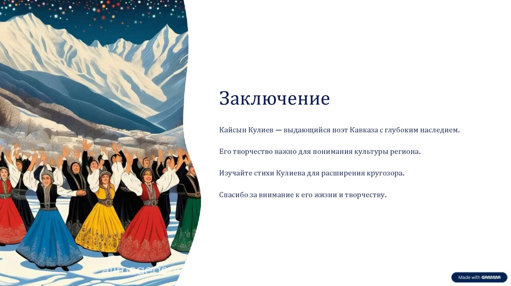 ЗаключениеКайсын Кулиев — выдающийся поэт Кавказа с глубоким наследием.