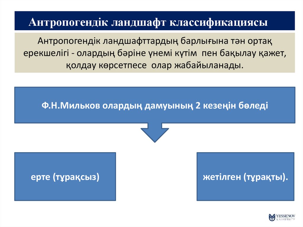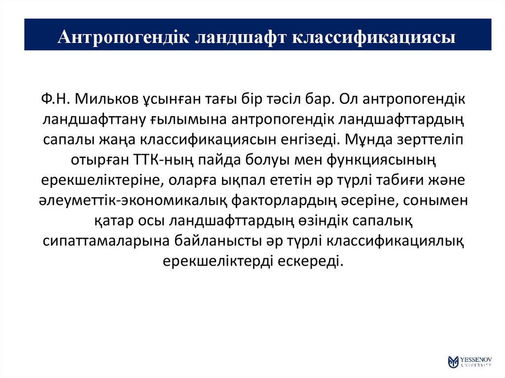 Антропогендік ландшафт классификациясыФ.Н. Мильков ұсынған тағы бір тәсіл бар. Ол антропогендік