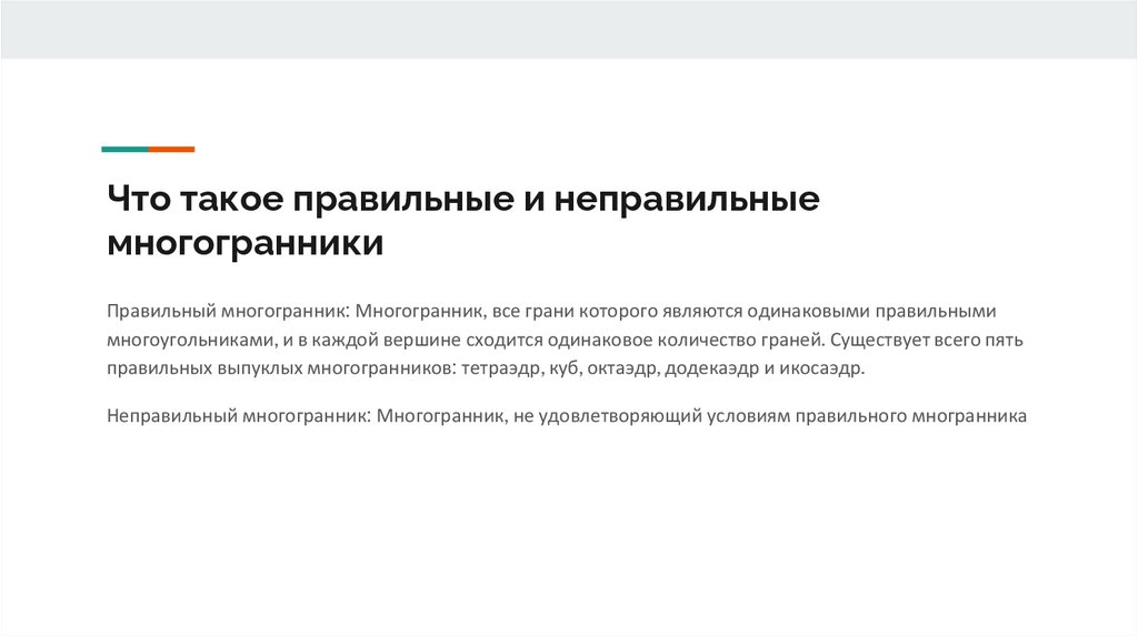 Правильный многогранник: Многогранник, все грани которого являются одинаковыми правильными