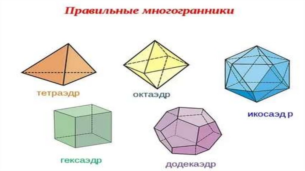 правильных выпуклых многогранников: тетраэдр, куб, октаэдр, додекаэдр и икосаэдр.