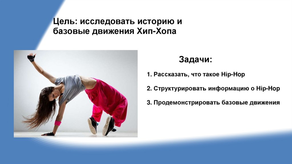 Цель: исследовать историю ибазовые движения Хип-Хопа