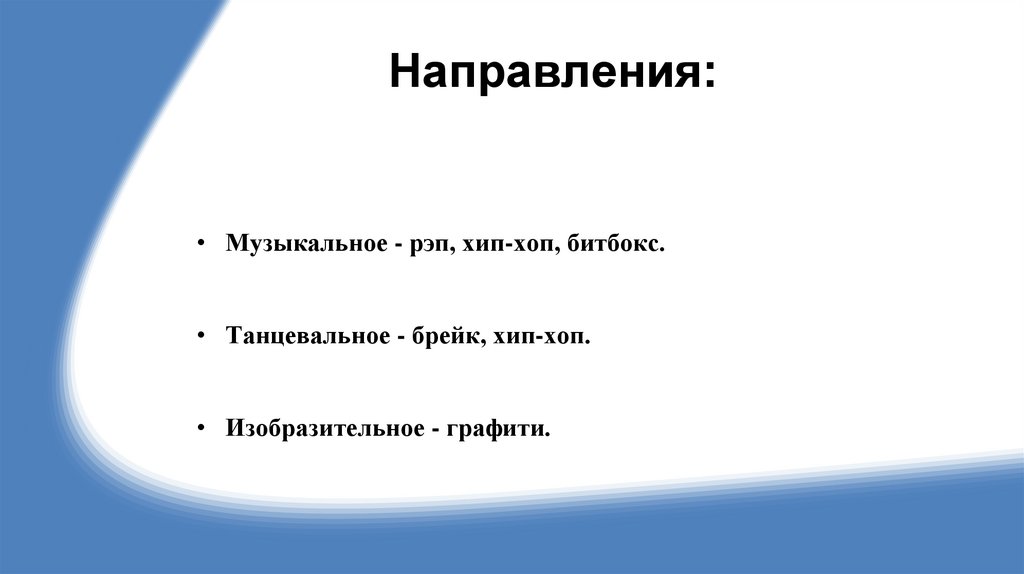 Направления:• Музыкальное - рэп, хип-хоп, битбокс.