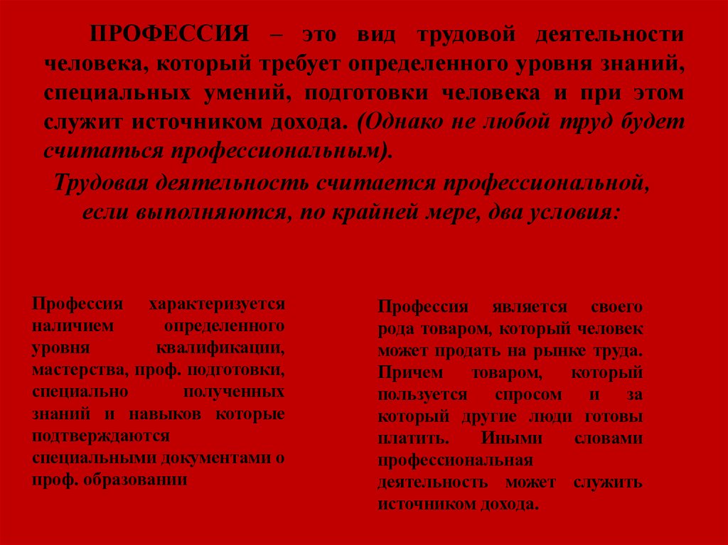 ПРОФЕССИЯ – это вид трудовой деятельностичеловека, который требует определенного уровня знаний,
