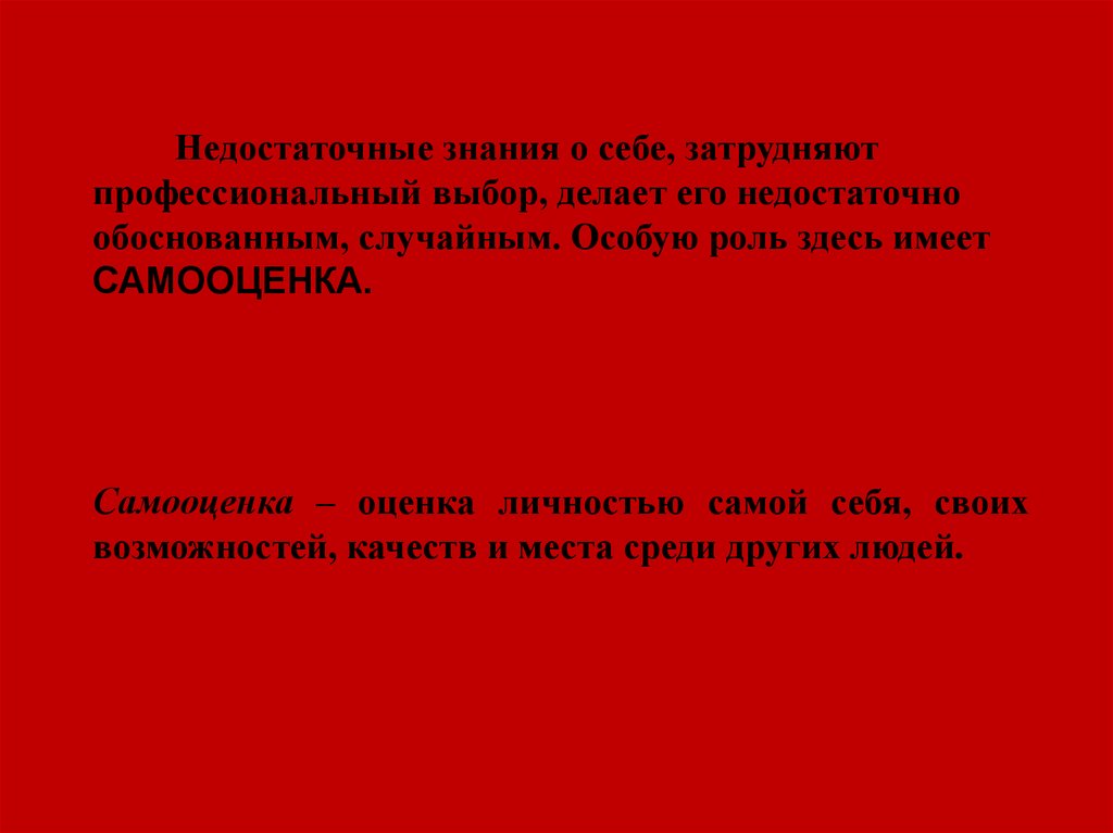 Недостаточные знания о себе, затрудняютпрофессиональный выбор, делает его недостаточно