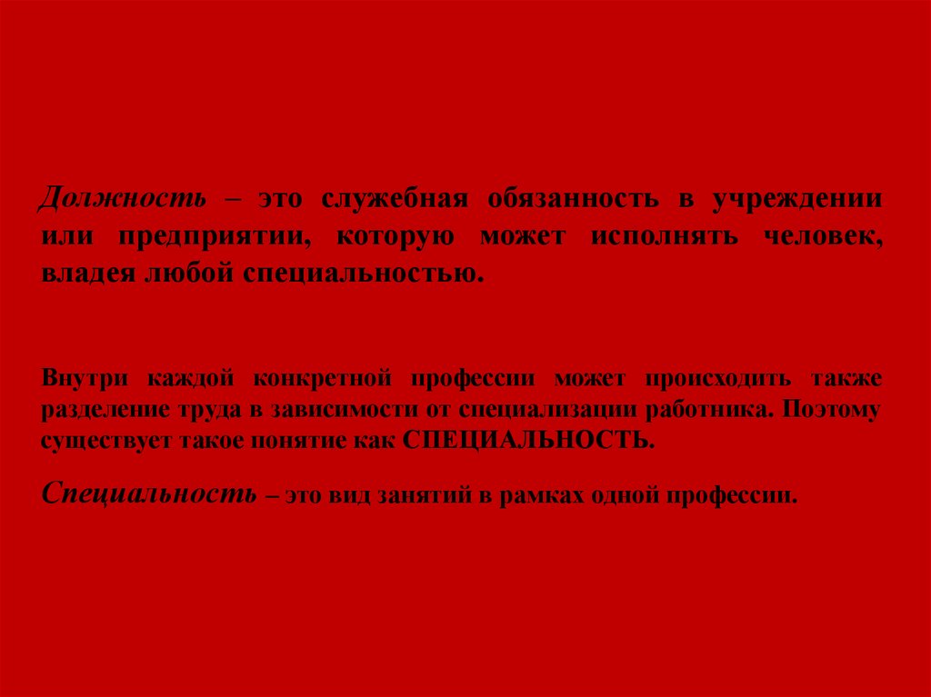 Должность – это служебная обязанность в учрежденииили предприятии, которую может исполнять человек,